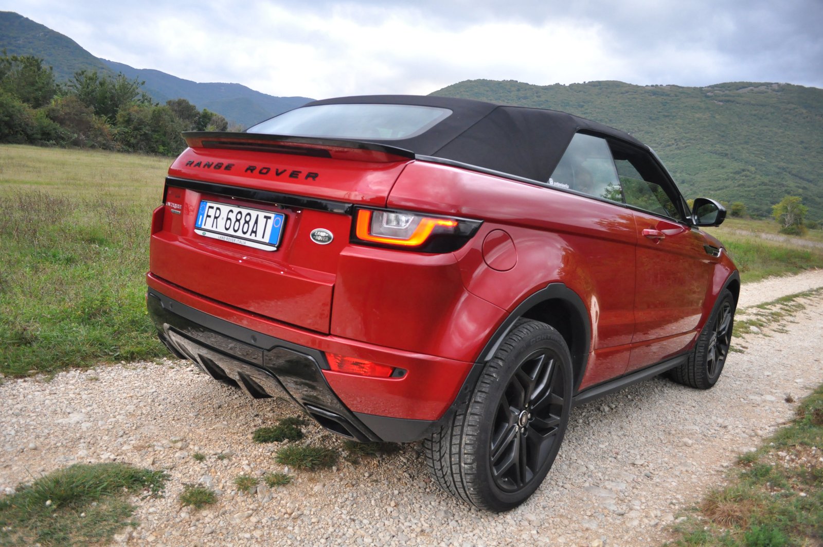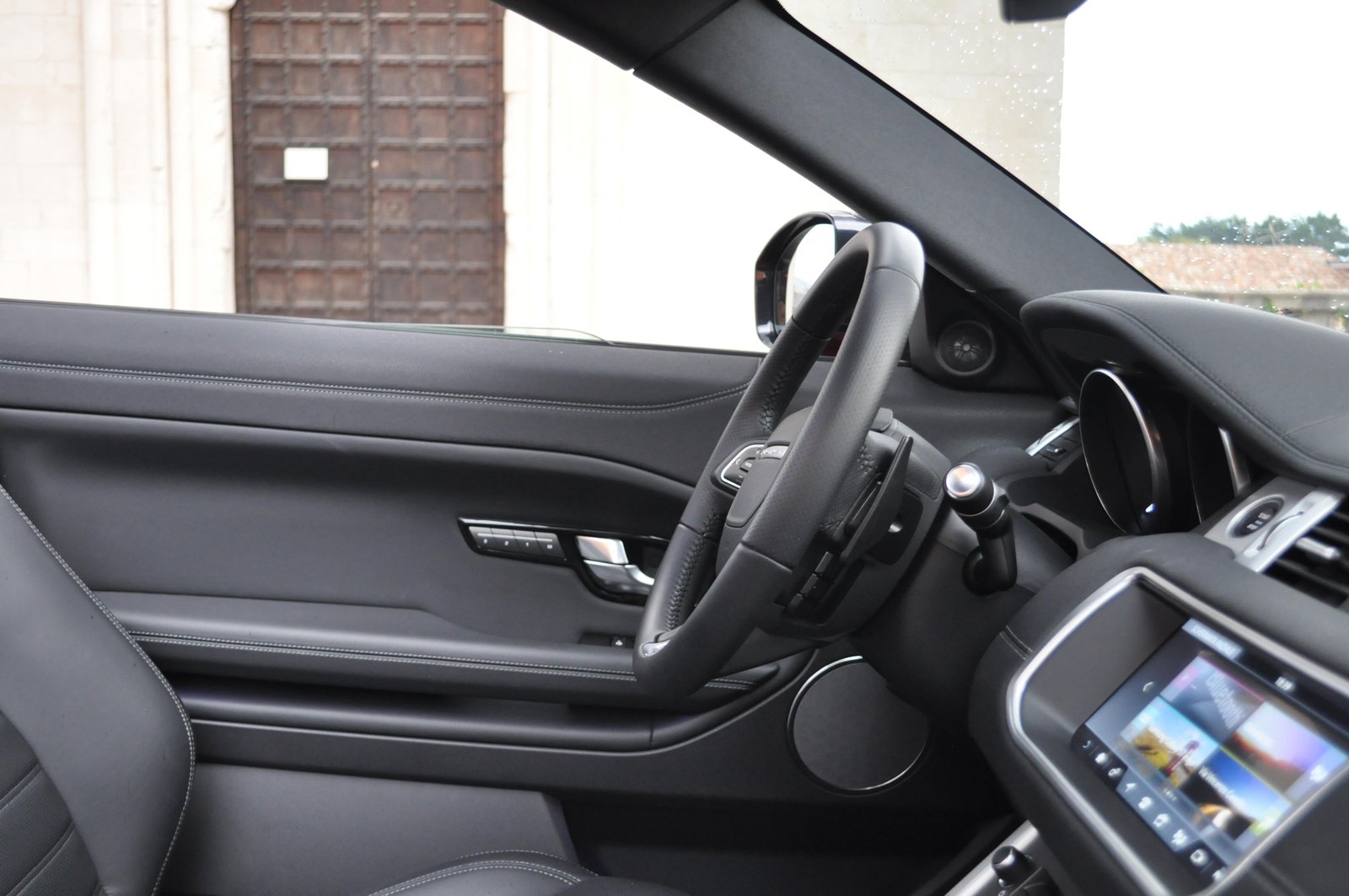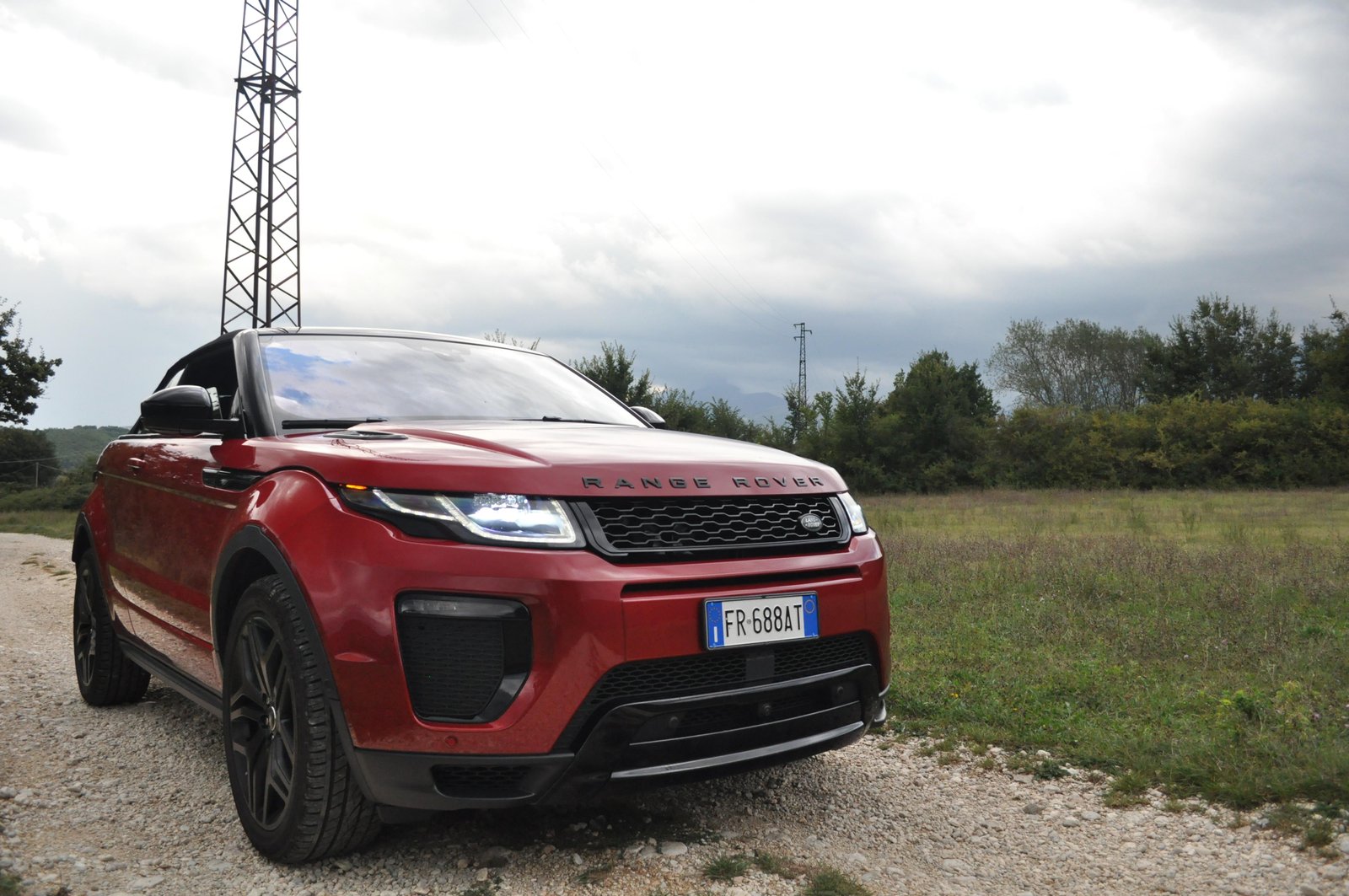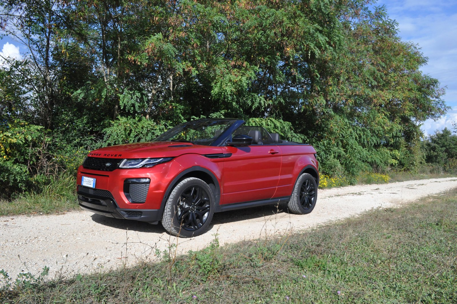 Il motore di questa prova è il 2.0 diesel da 240 CV abbinato al cambio automatico ZF a 9 rapporti. Su strada Evoque cabrio è divertente da guidare grazie ai suoi 500 Nm di coppia ed alla velocità massima di 217Km/h. Il cambio automatico ne valorizza lo scatto e, grazie alle palette dietro al volante, si riesce a tenere entrambe le mani sullo sterzo. Come per tutti SUV il baricentro della vettura è alto ma, anche in curva, l’auto non tende troppo a coricarsi. La vettura risente di un leggero rollio ma, l’ottimo lavoro svolto sulla solidità del pianale, evita comportamenti scomposti. Insomma il driver ha sempre la situazione sotto controllo. Ad andature meno sostenute Evoque si rivela docile e piacevole da guidare. La capote multistrato garantisce un’ottima insonorizzazione della vettura e, di conseguenza, le differenze rispetto alla versione coupé sono difficili da cogliere. Se scegliamo di montare il frangivento posteriore a tetto scoperto dovremo rinunciare alla seconda fila di sedili. In generale ottima guidabilità in città ed anche fuori; ma occhio ai consumi. Con il 2.0 diesel da 240CV è difficile fare meglio di 8,7 litri ogni 100km. Ad incidere è sicuramente il peso della vettura e le dimensioni generose dei cerchi opzionali da 20″ Satin Black.
