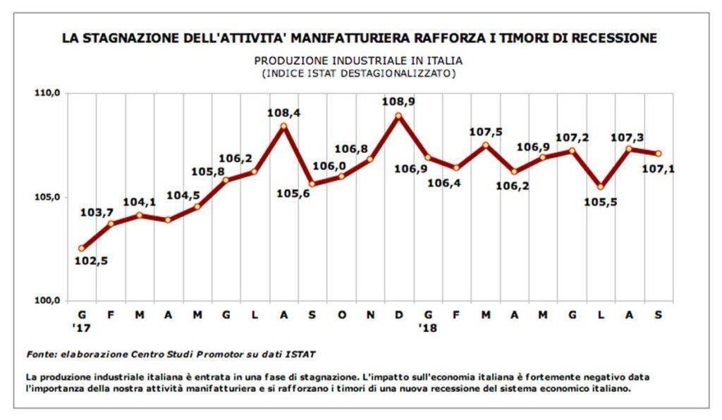 Il recente andamento della produzione industriale, secondo il Centro Studi Promotor, desta notevoli preoccupazioni in quanto accredita l’ipotesi che, dopo la crescita zero del Pil nel terzo trimestre, si delinei una recessione che sarebbe particolarmente grave perché il sistema economico italiano è ancora molto lontano dai livelli ante-crisi. Il Pil del terzo trimestre 2018 è infatti ancora al di sotto di quello del primo trimestre del 2008 del 4,9%.
