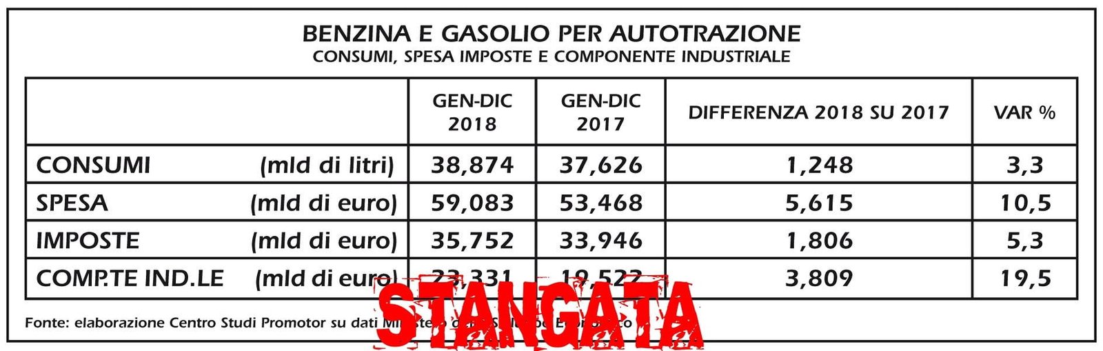 Della crescita della spesa degli italiani per l’acquisto di benzina e gasolio auto ha beneficiato in primo luogo l’Erario che, secondo le elaborazioni, ha incassato nel corso dell’anno 35,752 miliardi con un incremento di 1,806 miliardi sul 2017 (+5,3%). Anche la quota della spesa che va all’industria e alla distribuzione, cioè la componente industriale, ha però beneficiato dell’incremento sia dei consumi che dei prezzi. La somma incassata ha toccato quota 23,331 miliardi con un incremento del 19,5% sul 2017.