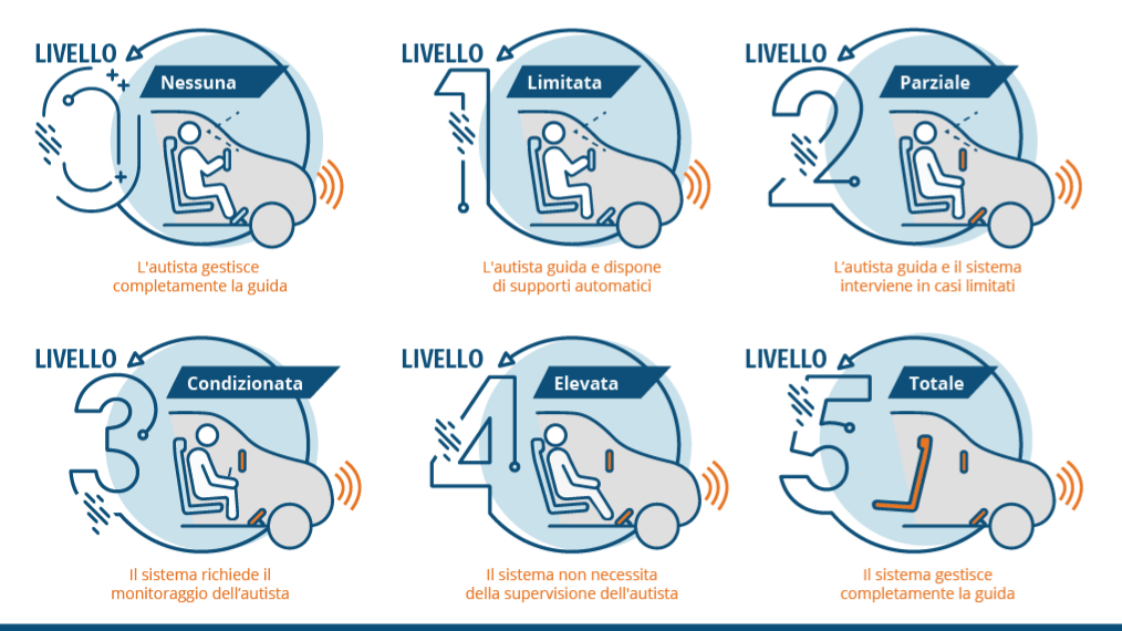 Interessante a tal proposito l’infografica realizzata dal portale online Noicompriamoauto.it. Come possiamo vedere, escludendo lo 0, sono 5 i livelli di autonomia al volante.