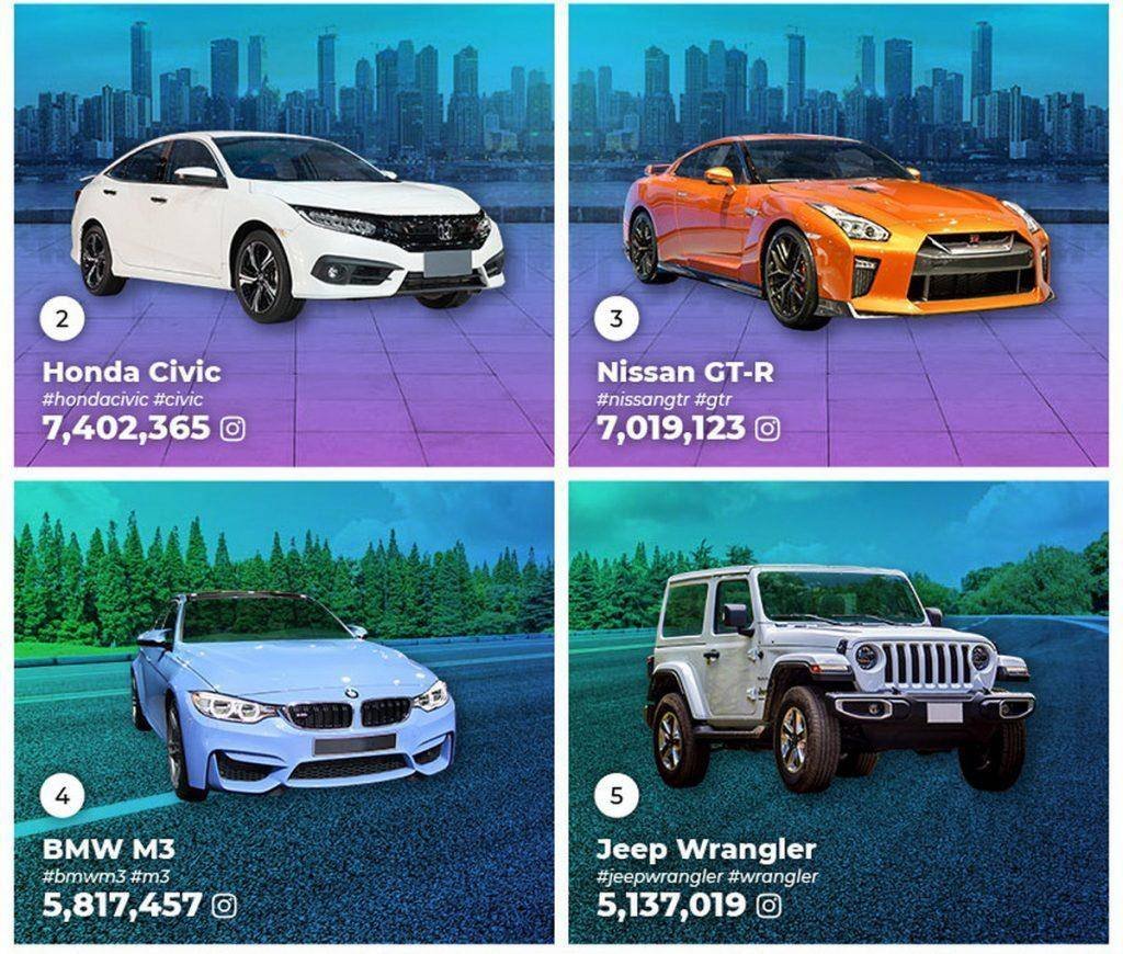 Gli altri mezzi inclusi nella top 10. C’è la BMW M3, Jeep Wrangler, Chevrolet Camaro, Chevrolet Corvette, BMW M4, Lamborghini Aventador, e Audi R8. Più in basso l’elenco comprende la BMW M5, Subaru Impreza, Chevrolet Silverado, Lamborghini Huracan, Mini Cooper, Porsche Carrera, e Porsche 911. Quando alla Honda Civic Type R è quindi considerata come un modello diverso rispetto alla normale Civic con un totale di 1.834.422 Instagram post.