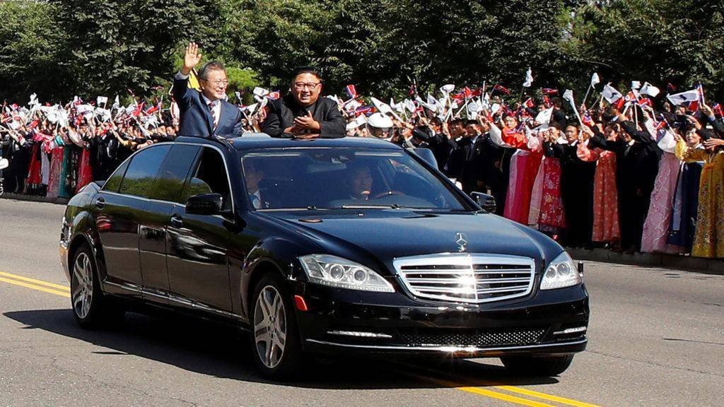 South Korean President Moon Jae-in and North Korean leader Kim Jong Un stand and wave in an open-air Mercedes-Benz as thousands of people welcome their motorcade in Pyongyang.