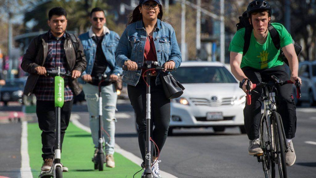 People ride a Neutron Holdings Inc. LimeBike, left, and Bird Rides Inc. shared electric scooters on the Embarcadero in San Francisco, California, U.S., on Friday, April 13, 2018. GPS-enabled scooters and bicycles are spreading across several major U.S. cities, driven by a wave of venture capital into a handful of companies. Policymakers are scrambling to find ways to regulate the great scooter boom of 2018. Photographer: David Paul Morris/Bloomberg