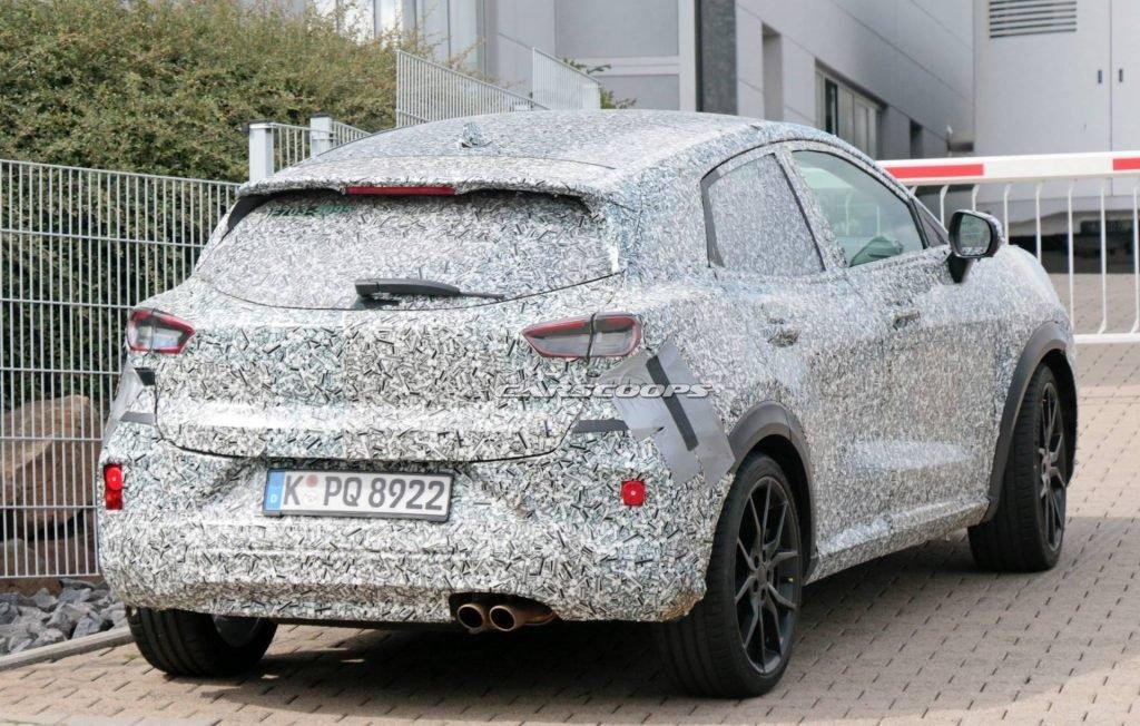 Il prototipo della Ford Puma ST presenta la carrozzeria di produzione finale con uno spoiler posteriore, ruote e freni più grandi, passaruota neri e due tubi di scarico.