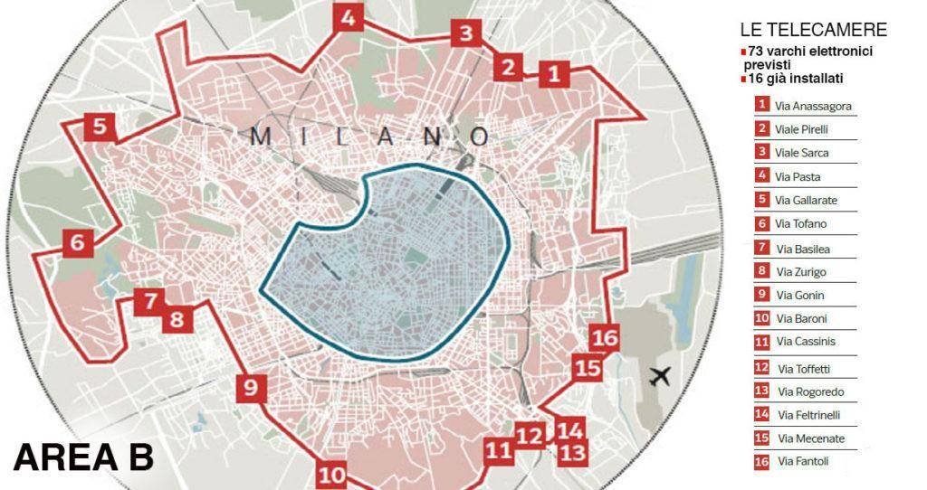 L‘Area B comprende gran parte del territorio della città di Milano ed è attiva dal lunedì al venerdì dalle ore 7.30 alle 19.30 (esclusi i festivi). A delimitarla ci sono 186 varchi elettronici. Chi entra senza averne diritto è sanzionato con una multa da 163 a 658 euro. In caso di recidiva nel biennio, ovvero se commette la stessa infrazione due volte in due anni, va incontro alla sospensione della patente da 15 a 30 giorni.