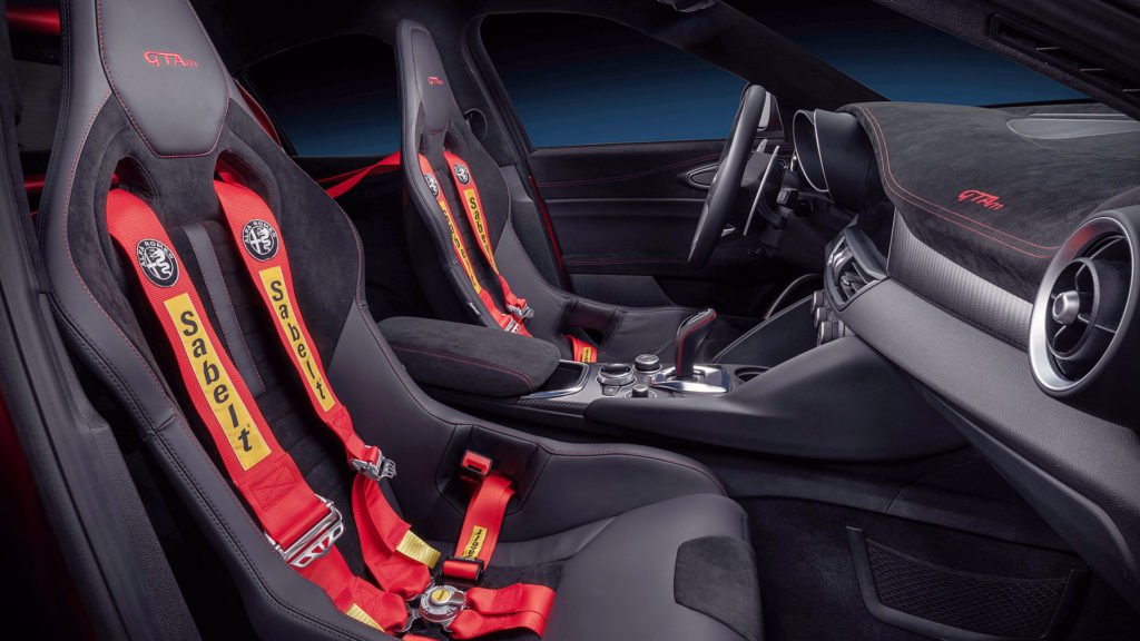 Questo ha una struttura cannettata, per garantire maggior comfort e un migliore contenimento durante le accelerazioni laterali. Le cuciture sono di tipo doppio, con colore a contrasto rosso e nero. Il sedile che Sabelt ha realizzato per l’Alfa Romeo Giulia GTAm presenta 5 passaggi dedicati all’applicazione della cintura di sicurezza di impostazione racing: due “fori” passa cintura sono stati ricavati sotto il poggiatesta, due nei borlotti laterali e uno al centro del cuscino. Sabelt si è presa cura anche della progettazione della cintura di sicurezza, realizzata appositamente per la nuova berlina ad alte prestazioni firmata Alfa Romeo. Si tratta di un modello racing a sei punti con ricamo personalizzato dotata di hardware leggeri in alluminio.