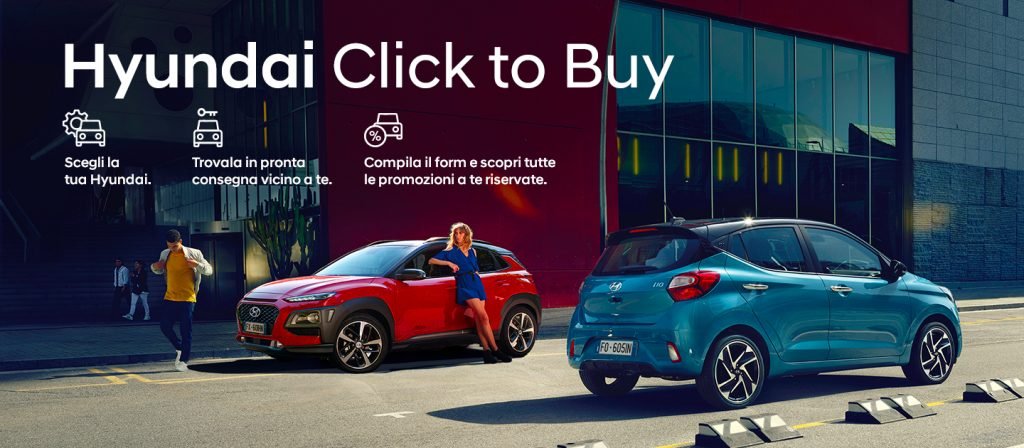 Sulla pagina relativa al servizio Click To Buy https://clicktobuy.hyundai.it/ProntaConsegna/ è possibile selezionare una delle auto della gamma Hyundai e la configurazione di interesse scegliendo le principali caratteristiche come allestimento, alimentazione, motorizzazione, trasmissione e colore esterno.