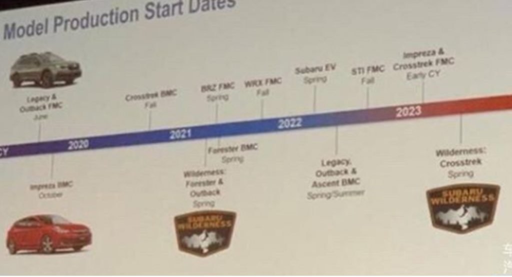 In primo luogo, si parla del restyling della Crosstrek atteso nel 2021. Più in basso sulla mappa, possiamo vedere le Forester e Outback “Wilderness” in produzione nella primavera del 2021. Si sa poco a riguardo, ma il nome suggerisce che potrebbero essere delle varianti un po’ più robuste dei modelli standard.