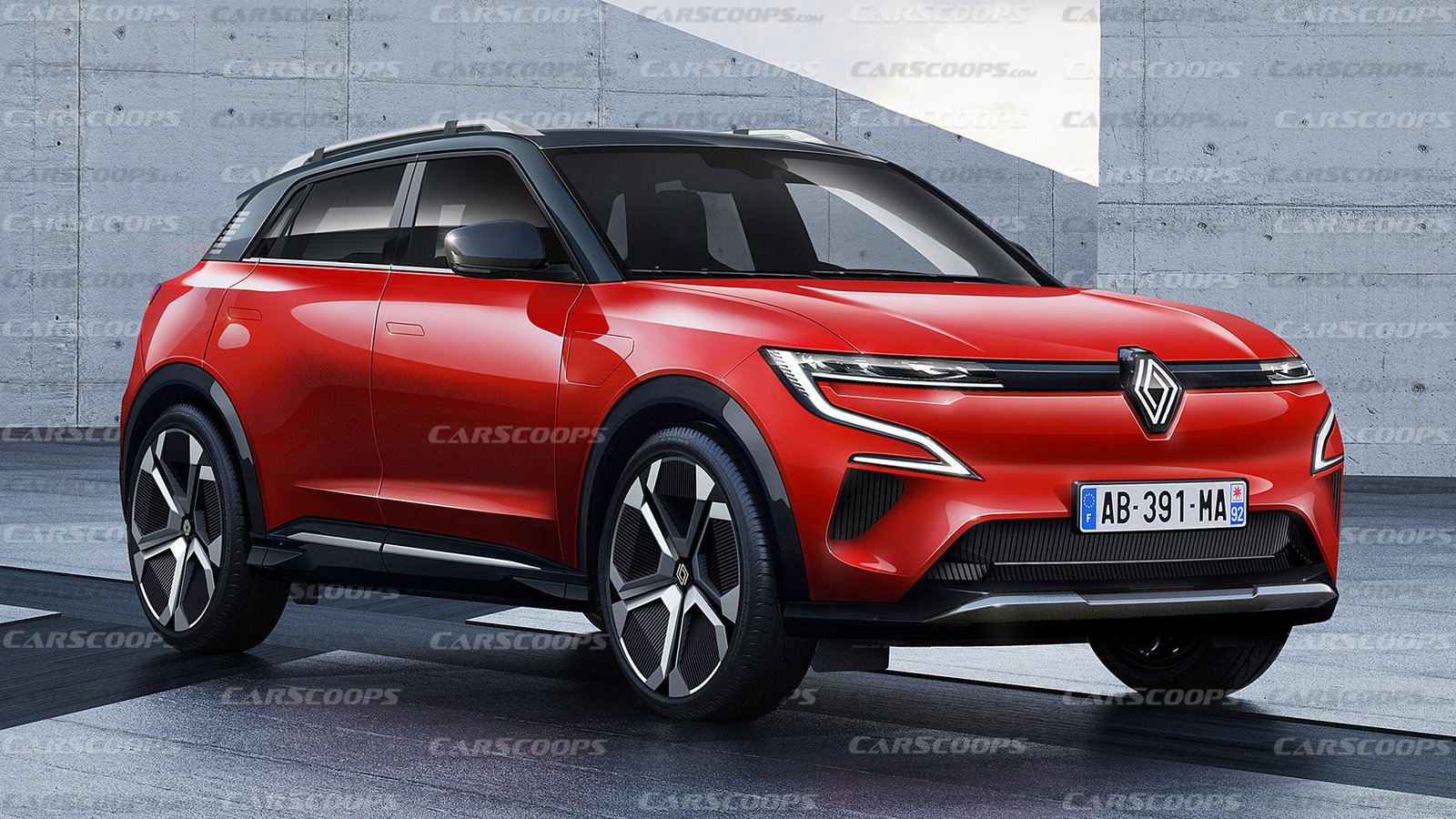 Il rendering raffigura un modello alto che incorpora l’ultimo linguaggio di design di Renault. I sottili fari a LED con una caratteristica firma luminosa, i parafanghi larghi si abbinano ad una combinazione di colori bicolore con un tetto scuro lo fanno sembrare un fratello maggiore della Mégane E-Tech.