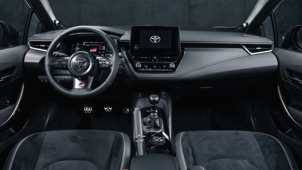 A liberare la potenza aggiuntiva è uno scarico più efficiente progettato per ridurre la contropressione, che culmina in una configurazione unica a tre tubi. Ci sono punte rotonde regolari agli angoli del paraurti posteriore, più una grande uscita singola al centro. È presente anche un sistema di valvole attive. Tutta quella potenza e quella coppia sono inviate attraverso un onesto cambio manuale a sei marce con una funzione di corrispondenza dei giri, lo stesso montato sulla Yaris GR – qui non c’è un’opzione automatica, come si diceva.