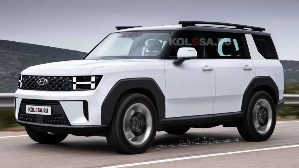 Per ora abbiamo alcune foto e video spia che mostrano un esemplare pesantemente camuffato. Tuttavia, possiamo già vedere che il modello otterrà una carrozzeria angolare completamente nuova che ricorda l’ultima generazione di Defender. I finestrini hanno una forma simile e i montanti del parabrezza sono neri. Il frontale è reso quasi verticale e i fari riceveranno luci di marcia a LED a forma di “H”. I passaruota sono rotondi, ma gli ampi rivestimenti in plastica sono resi angolari. Nelle foto spia il posteriore è ancora pesantemente camuffato, si possono vedere solo le luci orizzontali situate nella parte inferiore del cofano del bagagliaio. È possibile che la Hyundai Santa Fe adotti anche unità verticali come quelle già viste sul futuristico minivan Staria. Questi rendering di Kolesa.ru ci permettono di dare un primo sguardo al modello.