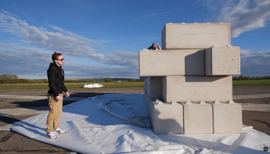 L’impresa si è rivelata alquanto difficile, poiché si è scoperto che i progettisti francesi si preoccupano di non mettere grandi muri sulle autostrade. Così hanno affittato un campo d’aviazione e hanno assemblato 72 blocchi di cemento per formare un muro che, secondo le stime, pesa circa 86 tonnellate.