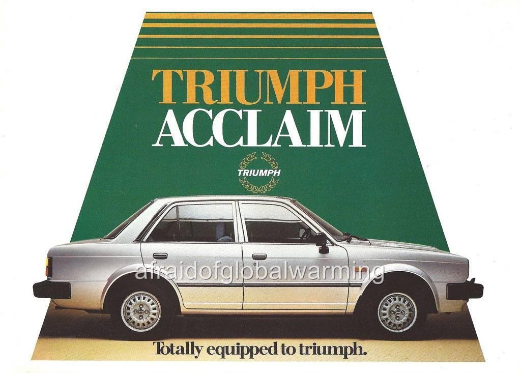 Della “Acclaim” si può dire poco: solo 135.000 unità prodotte (900 a settimana contro una previsione di 1.500), ottima qualità, robustezza, finitura, tenuta di strada ed ottima meccanica. Solo un neo: una tipologia di auto assolutamente in antitesi con la riconoscibilità del Marchio Triumph. A parte questo, fu capace di rappresentare in tutta Europa un primo esempio di eccellenza in un mercato comunque non indifferente, visto l’elenco delle sue avversarie: direttamente le antagoniste a 3 Volumi e 4 porte erano Renault R9, VW Jetta/Audi 80, Fiat 128, Volvo Serie 300; concorrenti per “rango” erano Lancia Delta, Opel Kadett, Talbot Horizon; e le concorrenti “esotiche” erano di già Hyundai Pony e saranno poco dopo Alfa “A.R.N.A.”, Mitsubishi Galant, Mazda 323 FF.