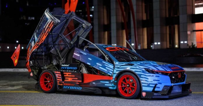 Le ruote e i pneumatici più larghi sono anche il motivo della carrozzeria inferiore personalizzata in fibra di carbonio che incorpora parafanghi svasati e condotti di aspirazione NACA. Per quanto riguarda l’aerodinamica questa Honda CR-V Hybrid Racer è dotato di un grande splitter anteriore e di un alettone posteriore, oltre che di un massiccio diffusore posteriore. Per quanto riguarda gli interni, quasi tutta la praticità è stata eliminata per un abitacolo da corsa che può ospitare un guidatore e un passeggero anteriore.