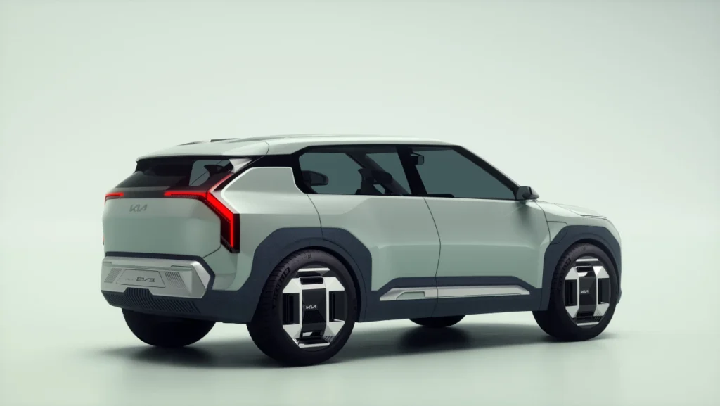 Con dimensioni più o meno simili a quelle della Kia Sportage, la EV3 appare più massiccia e aggressiva nel suo aspetto. In linea con gli altri recenti SUV elettrici di Kia, come l’EV9 e l’EV5, l’EV3 utilizza temi visivi spigolosi simili, in continuità con l’attuale linguaggio stilistico dell’azienda.