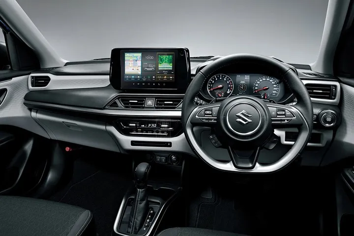 L’abitacolo della nuova Suzuki Swift con guida a destra presenta uno stile più sportivo e un quadro strumenti analogico con i classici quadranti cromati al posto del display digitale. Anche la console centrale è stata rinnovata, abbandonando le tipiche bocchette dell’aria rotonde a favore di quelle quadrate più elaborate. Il touchscreen sopra il sistema di infotainment è accompagnato da una striscia con tasti di scelta rapida sensibili al tocco.