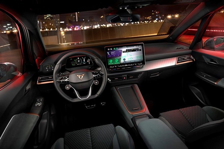 L’abitacolo della nuova Cupra Born VZ è caratterizzato da sedili anteriori a secchio, esclusivi per questa versione, con supporto laterale sviluppato e rivestimenti ecologici combinati. Il pannello anteriore è dotato di uno schermo multimediale da 12,9 pollici più grande rispetto alle altre versioni. Le palette del sottosterzo consentono di regolare istantaneamente la potenza rigenerativa del motore elettrico. Come optional è disponibile un impianto audio Sennheiser di fascia alta da 425 watt con dieci altoparlanti.