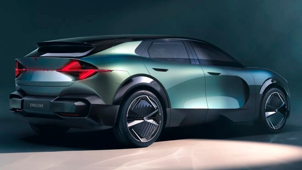 Il cofano più arrotondato della Renault Emblème è una chiara indicazione che si tratta di un concorrente per entrare nel mercato delle auto elettriche, ed è anche dotato di grandi cerchi in lega con un design altamente aerodinamico. Renault ha disegnato una silhouette con un forte accento Shooting Brake, con un grande montante posteriore inclinato che rafforza l’aspetto da coupé e un posteriore particolarmente originale con luci posteriori a raggiera.