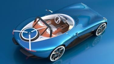 L’interno della Scoperta è caratterizzato da un quadro strumenti molto originale, stilizzato in modo da sembrare il quadrante di sintonia di una radio a valvole. Da lontano il volante sembra a una sola rampa, come nelle vecchie Citroen, ma in realtà è a tre razze, con grandi pulsanti quadrati per gli indicatori di direzione, il clacson e gli abbaglianti sulle razze laterali oscurate. I poggiatesta dei sedili sono completamente separati dagli schienali e poggiano su sottili cornici fissate alla superficie superiore della carrozzeria. Il deflettore del vento davanti all’abitacolo è molto basso, quindi la Scoperta dovrà ovviamente essere guidata con il casco.
