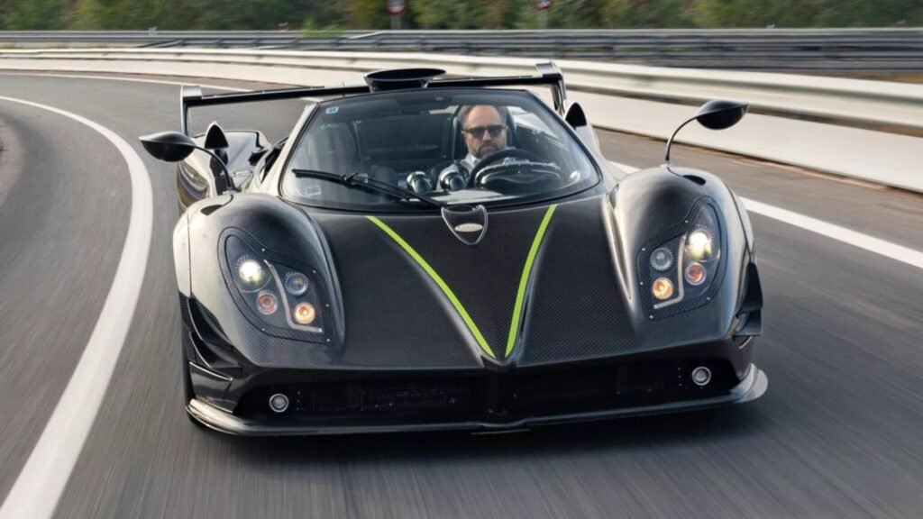 Ogni centimetro dell’esterno è ornato da una splendida fibra di carbonio laccata in contrasto con accenti di verde brillante, anche sul cofano, sul cofano motore, sulle fiancate e sulle ruote. Come la LM Coupé, la LM Roadster adotta pannelli anteriori a forma di bulbo che ospitano fari distintivi non presenti su nessun altro modello di Zonda 760. L’auto presenta anche lo stesso splitter anteriore, i brancardi, le feritoie dei passaruota anteriori, il diffusore posteriore, il cofano motore e la bombatura del tetto dell’iconica Zonda Cinque.