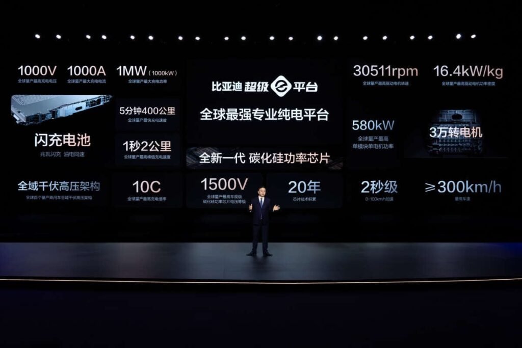 Mentre molti veicoli elettrici (EV) sul mercato operano su un’architettura elettrica da 800 V, BYD ha fatto un passo avanti con la sua nuova Super e-Platform. Funzionante a 1.000 V, la nuova piattaforma è in grado di assorbire fino a 1.000 A di corrente, il che consente di raggiungere una potenza di carica di 1.000 kW (o 1MW).