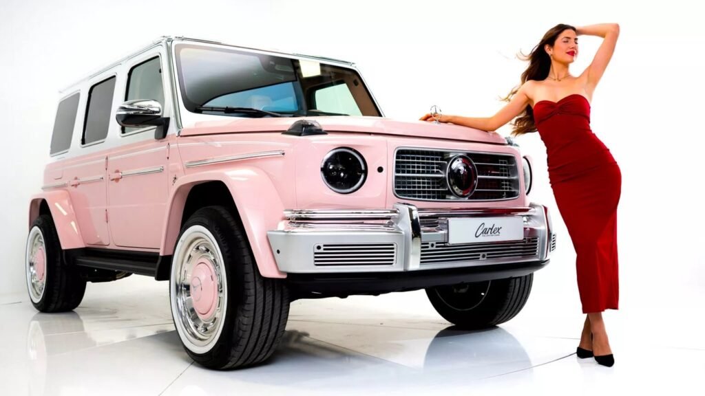 La verniciatura è il punto in cui le cose iniziano a farsi notare. La metà inferiore della carrozzeria è dipinta in una tenue tonalità di rosa, mentre la metà superiore è bianca. È disponibile anche un set di ruote retrò con centro rosa, raggi cromati e pneumatici bianchi. Il porta ruota di scorta di Carlex completa il nuovo design, imitando perfettamente la forma e la finitura delle ruote reali.