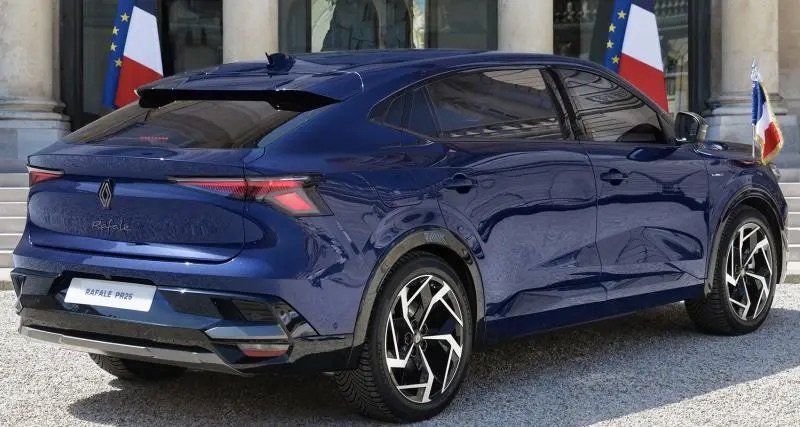 All’esterno, il Renault Rafale Presidenziale si distingue per la griglia frontale con sfumature tricolori, portabandiera rimovibili e badge blu, bianco e rosso sulle portiere anteriori. La tinta esclusiva “Bleu Présidence” incorpora una tecnologia che riduce l’assorbimento del calore fino a 10 °C, migliorando il comfort termico dell’abitacolo. Inoltre, contiene glitter tricolori visibili alla luce del sole. Le portiere posteriori sono dotate di chiusura assistita “soft-close”, per una manipolazione fluida e silenziosa. I portabandiera sono integrati nella carrozzeria tramite sportelli a scomparsa, per un’estetica discreta e armoniosa.
