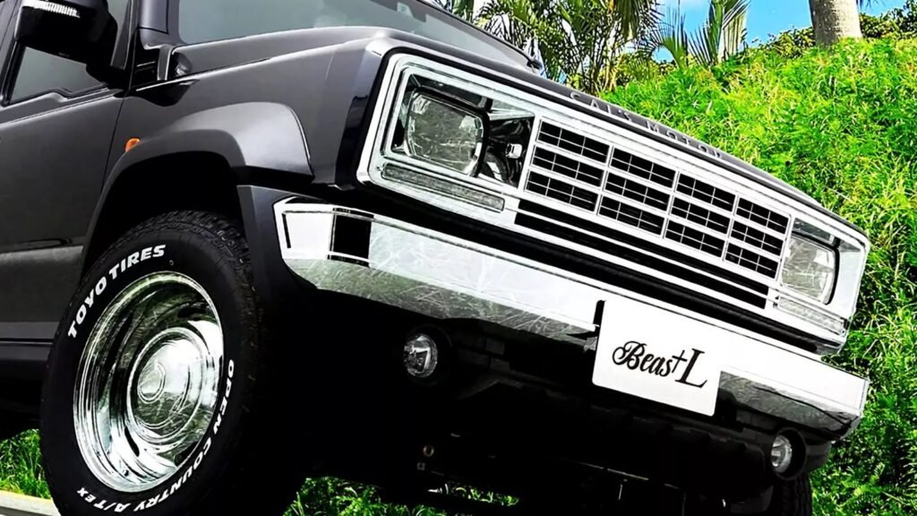 Il punto forte è la griglia cromata ridisegnata, che ospita fari LED rettangolari con indicatori separati. Il muso ispirato alla Chevy K5 Blazer è abbinato a un paraurti cromato coordinato e a fari antinebbia riposizionati. L’emblema Suzuki è stato sostituito dalla scritta Cal’s Motors sul cofano.
