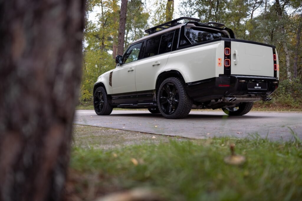 Il pick-up nero basato sul Defender 130 è una variante del tuning britannico Urban Automotive, che insieme a Heritage Customs fa parte del gruppo AM Group. Questo gruppo, con sede nei Paesi Bassi, è specializzato in vari tipi di tuning. Nello specifico, Urban Automotive lavora in uno stile brutale, ama il colore nero, il carbonio, le ruote grandi e le carrozzerie in rilievo.