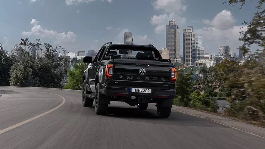 Anche la parte posteriore del nuovo Volkswagen Amarok Dark Label presenta alcune differenze rispetto alla versione standard. Il modello è dotato di fanali oscurati, una barra nero opaco che attraversa tre lati del pianale di carico, vetri posteriori oscurati e un bordo ribaltabile con maniglia nera (in alcune altre versioni è verniciata dello stesso colore della carrozzeria).