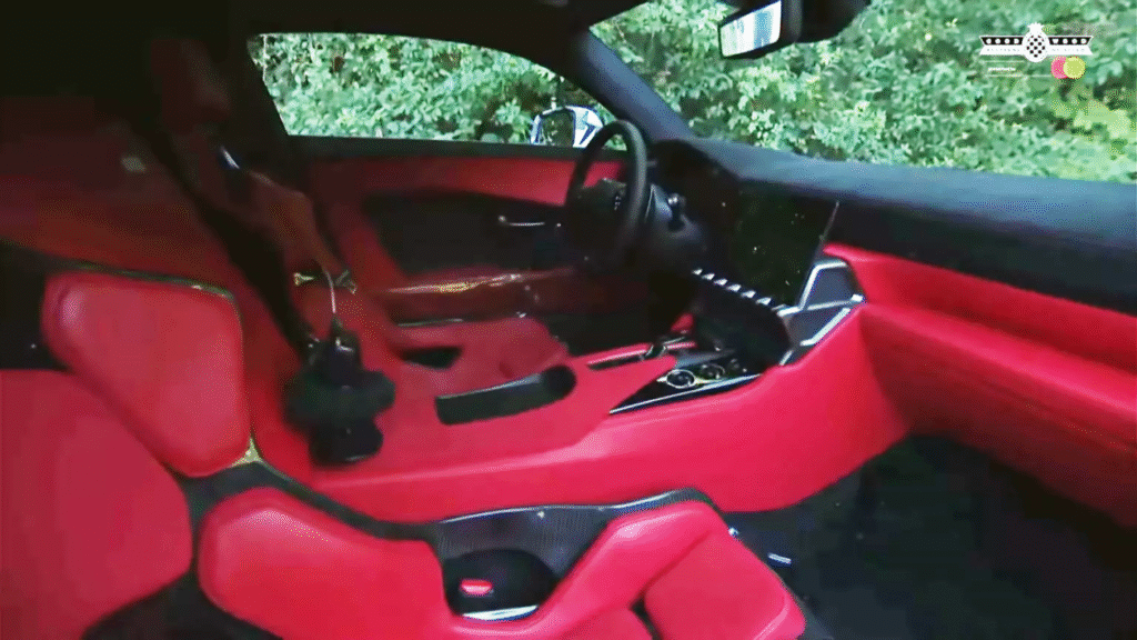 Non abbiamo immagini degli interni nello spot, ma il livestream ufficiale dell’evento di Goodwood ha mostrato un grande display di infotainment posizionato sopra una fila di comandi fisici. L’abitacolo del prototipo è un mix di pelle rossa e Alcantara, con il materiale in pelle utilizzato per l’imbottitura dei sedili avvolgenti in fibra di carbonio.