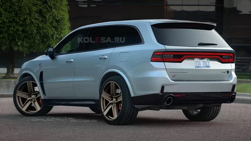 Il crossover ha nuovi specchietti esterni su gambe e i vetri laterali sono realizzati in un unico pezzo per un look più moderno (inoltre, le porte hanno perso i telai dei finestrini, simili alla Charger). Il dettaglio più caratteristico della parte posteriore dell’attuale Durango sono i fanali massicci che si estendono per tutta la larghezza. Il crossover mostrato nei rendering ha fanali posteriori simili, ma in uno stile più moderno.